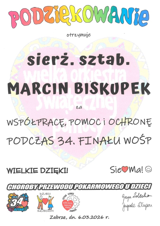 Kilka dni Temu do Komisariatu III Policji w Zbarzu j wpłynęło oficjalne podziękowanie za zabezpieczenie 34. Finału Wielkiej Orkiestry Świątecznej Pomocy. Wyrazy uznania dotyczą działań podejmowanych przez policjantów, którzy dbali o bezpieczeństwo uczestników wydarzenia oraz kwestujących wolontariuszy. Szczególnie wyróżniony został dzielnicowy sierżant sztabowy Marcin Bisakupek.
